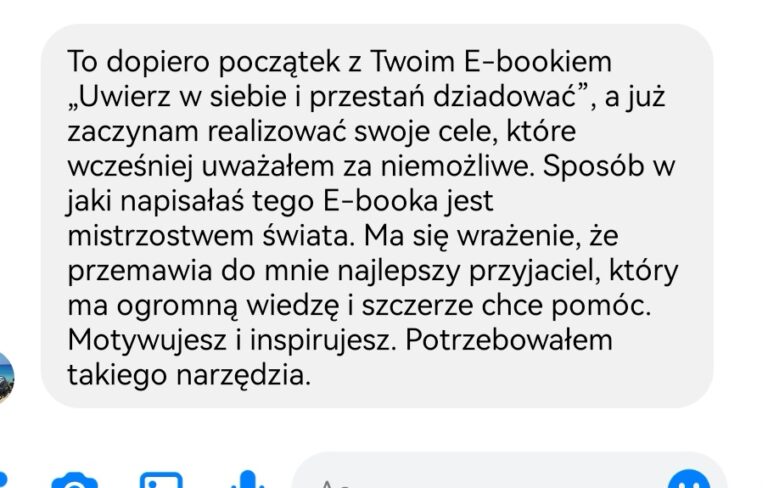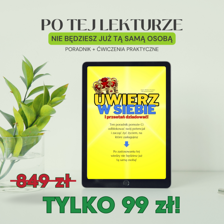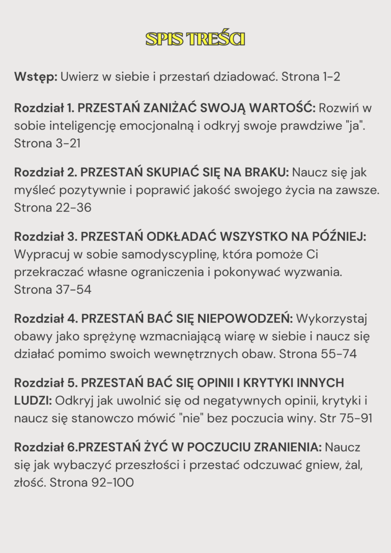 BESTSELLEROWY PORADNIK „UWIERZ W SIEBIE I PRZESTAŃ DZIADOWAĆ” O WARTOŚCI 249zł. Poradnik jest książką w formie elektronicznej, PDF. Po zakupie otrzymasz natychmiastowy dostęp do Poradnika. Otworzysz go na każdym urządzeniu mobilnym, takim jak Twój telefon, tablet, laptop. Nie potrzebujesz żadnego specjalnego oprogramowania. Jeśli potrafisz przeczytać ten tekst, to przeczytasz również ten Poradnik. Poradnik składa się z sześciu rozdziałów.ROZDZIAŁ 1: PRZESTAŃ ZANIŻAĆ SWOJĄ WARTOŚĆ: Rozwiń w sobie inteligencję emocjonalną i odkryj swoje prawdziwe „ja”. ROZDZIAŁ 2: PRZESTAŃ SKUPIAĆ SIĘ NA BRAKU: Naucz się jak myśleć pozytywnie i poprawić jakość swojego życia na zawsze. ROZDZIAŁ 3: PRZESTAŃ ODKŁADAĆ WSZYSTKO NA PÓŹNIEJ: Wypracuj w sobie samodyscyplinę, która pomoże Ci przekraczać własne ograniczenia i pokonywać wyzwania. ROZDZIAŁ 4: PRZESTAŃ BAĆ SIĘ NIEPOWODZEŃ: Wykorzystaj obawy jako sprężynę wzmacniającą wiarę w siebie i naucz się działać pomimo wewnętrznych obaw. ROZDZIAŁ 5: PRZESTAŃ BAĆ SIĘ OPINII I KRYTYKI INNYCH LUDZI: Odkryj jak uwolnić się od negatywnych opinii, krytyki i naucz się stanowczo mówić „nie” bez poczucia winy. ROZDZIAŁ 6: PRZESTAŃ ŻYĆ W POCZUCIU ZRANIENIA: Naucz się jak wybaczyć przeszłości i przestać odczuwać gniew, żal, złość.