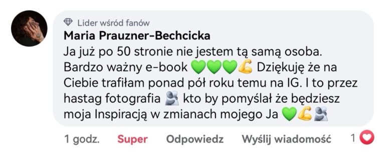 DOSTĘP DO ZAMKNIĘTEJ GRUPY WSPARCIA, KTÓREJ NIE DA SIĘ WYCENIĆ. Otrzymasz dostęp do zamkniętej grupy na Facebooku, gdzie członkowie wspierają się nawzajem, wymieniają doświadczeniami, motywują, inspirują.
