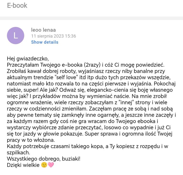 Hej! Jestem tak pewna tego, że ten poradnik Ci pomoże, że oferuję pełny zwrot pieniędzy. Wystarczy, że wyślesz mi email na violet@przystarz.com razem z notatkami potwierdzającymi, że zrobiłeś/łaś wszystkie 20 ćwiczeń zawarte w moim poradniku oraz informację, że u Ciebie nie zadziałały. ZERO RYZYKA PO TWOJEJ STRONIE!
