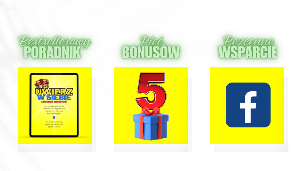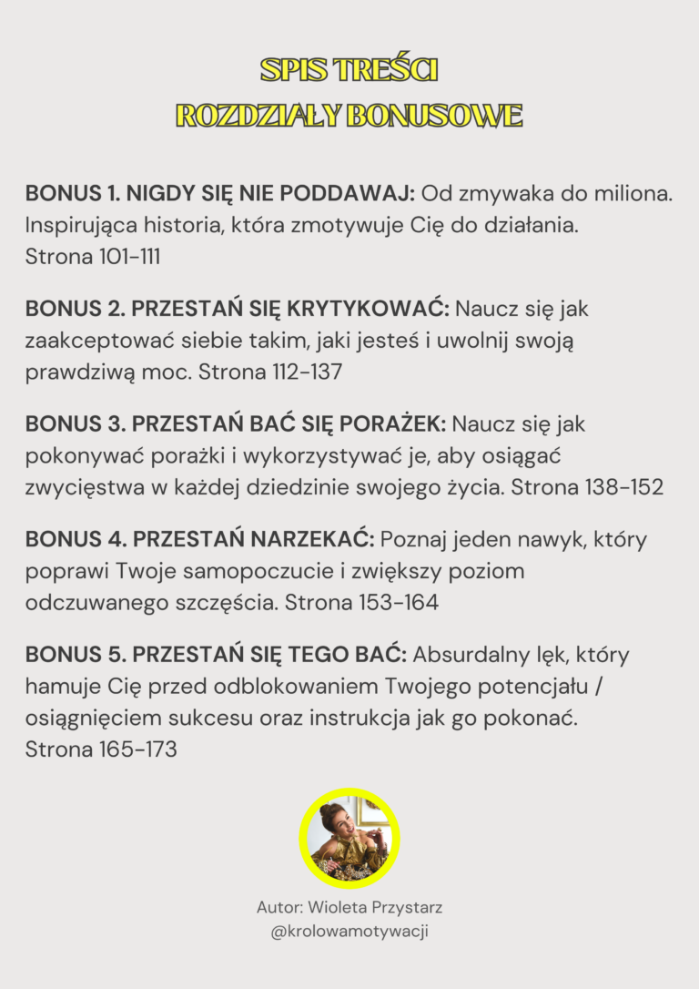 5 BONUSÓW O ŁĄCZNEJ WARTOŚCI 300zł. Wraz z Poradnikiem otrzymasz 5 bonusowych rozdziałów. BONUS NR 1: NIGDY SIĘ NIE PODDAWAJ: Od zmywaka do miliona. Inspirująca historia, która zmotywuje Cię do działania.BONUS NR 2: PRZESTAŃ SIĘ KRYTYKOWAĆ: Naucz się jak zaakceptować siebie takim, jaki jesteś i uwolnij swoją prawdziwą moc. BONUS NR 3: PRZESTAŃ BAĆ SIĘ PORAŻEK: Naucz się jak pokonywać porażki i wykorzystywać je, aby osiągnąć zwycięstwa w każdej dziedzinie swojego życia. BONUS NR 4: PRZESTAŃ NARZEKAĆ: Poznaj jeden nawyk, który poprawi Twoje samopoczucie i zwiększy poziom odczuwanego szczęścia. BONUS NR 5: PRZESTAŃ SIĘ TEGO BAĆ: Absurdalny lęk, który hamuje Cię przed odblokowaniem Twojego potencjału / osiągnięciem sukcesu oraz instrukcja jak go pokonać.