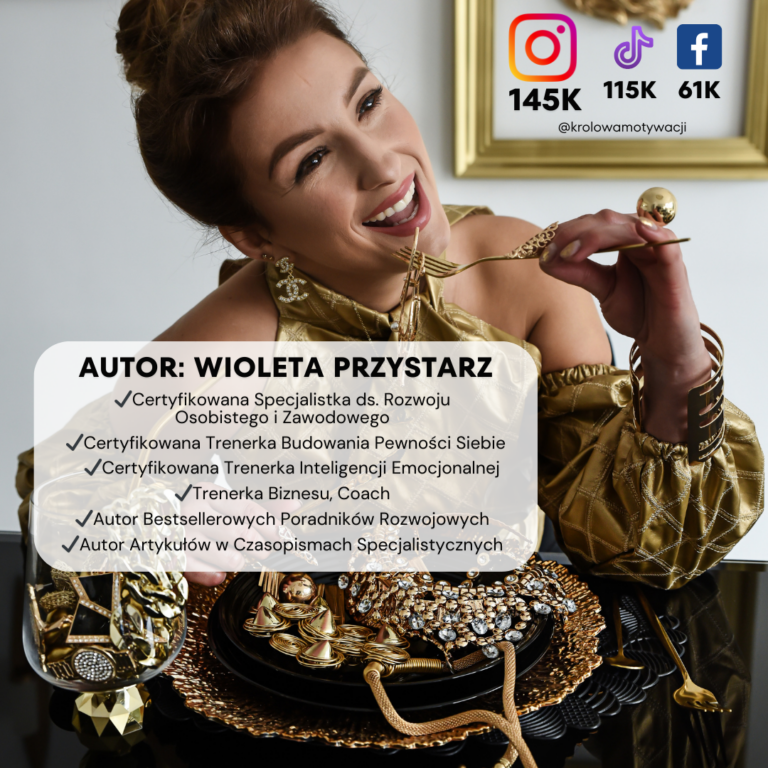 Nazywam się Wioleta Przystarz, a w świecie internetowym jestem znana jako @krolowamotywacji. Jestem przede wszystkim Certyfikowaną Specjalistką do spraw Rozwoju Osobistego i Zawodowego. W ciągu ostatnich 12 miesięcy przeprowadziłam kilkadziesiąt godzin sesji coachingowych. Analizując pojawiające się schematy, uświadomiłam sobie konieczność stworzenia narzędzia, które będzie dostępne dla wszystkich, aby jak największa liczba Polaków miała szansę odmienić swoje życie